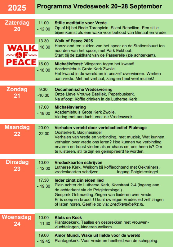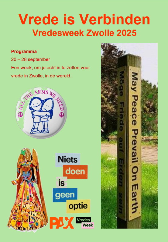In 2025 is het thema van de Vredesweek in Zwolle: Vrede is verbinden aansluitend op het landelijke thema ‘Niets doen is geen optie.’ Wanneer we geconfronteerd worden met onrecht en uitsluiting in onze stad, ons land, Europa, Palestina en Israël, Soedan en Myanmar kunnen we niet wegkijken. We moeten actief verbinding zoeken, bruggen bouwen en mensen erkennen in hun volledige menselijkheid. Want vrede vraagt om actie: dus maak, bouw, pleit, doe, eis vrede. Dus stel jezelf en anderen de vraag ‘Wat doe jij?’ voor vrede.