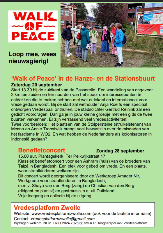 De Walk of Peace op zaterdag 20 september begint om 13.30 bij de zuidkant van de nieuwe Passerelle. Wethouder Anja Roelfs opent de Walk of Peace. Daarna leest de stadsdichter Gertrüd Reinink een speciaal voor deze gebeurtenis geschreven gedicht voor. We onthullen een tijdelijke vredespaal en het Zwols Vredesplatform zorgt dat iedere deelnemer in een klein groepje bij een gids aansluit.