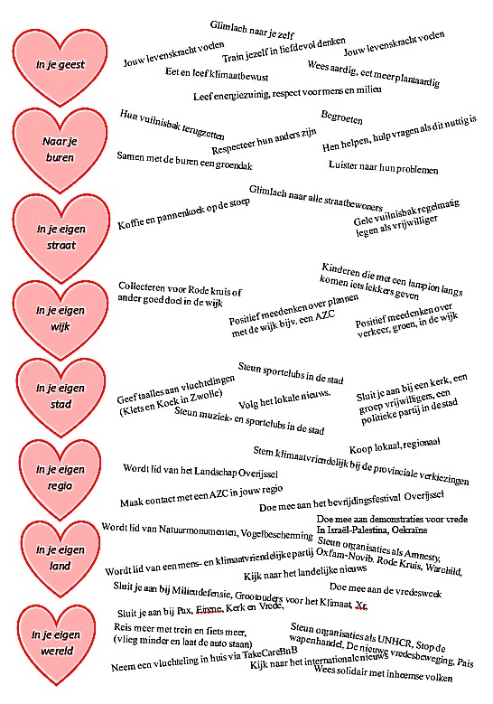 Neem bijvoorbeeld eens een papiertje en schrijf tien activiteiten op die aan de vrede in brede zin bijdragen.